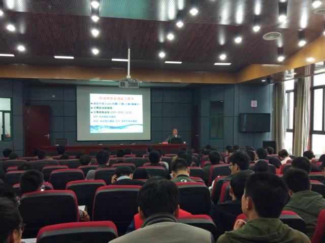 李教授首先以“为天地立心 、为生民立命 、为往圣继绝学 、为万世开太平”的人生使命为大家从学业、社团、感情等方面分析了大学生活的内容,并给予了同学们一些建议;随后李教授详细介绍了环境科学与工程所要研究的海陆空三个方向和具体内容;之后,给同学们分享了高潜力环保发展项目:节能减排、危废处理及饮用水处理,其中详细讲解了瓦斯节能减排实例,让同学们了解了DPF和DOC的概念以及加入ABE降低PM2.5的方法;最后,介绍了实验室危险废弃物的处理、全球饮用水的现状以及海水淡化最新技术。