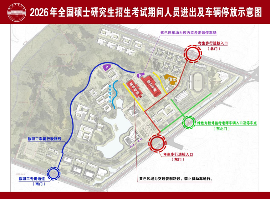 2026年全国硕士研究生招生考试将于2025年12月20—21日举行,届时校区新安学堂和敬亭学堂将作为考场。为保证考试期间良好的交通秩序,考试期间将对校园部分路段实行临时交通管制,具体如下: