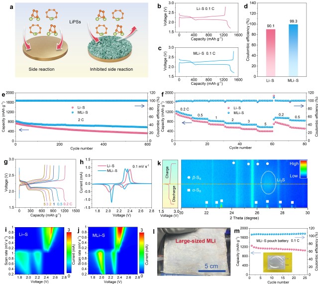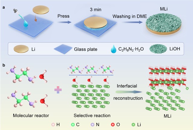 当用于锂硫电池时,C2H8N2·H2O 改性的锂(MLi)有效缓解了可溶性多硫化锂的侵蚀,锂金属负极和电池性能均显著提高。通过优化电解液的成分、界面反应时间、分子反应器的种类以及反应工艺技术,电池的性能可得到进一步提升。其它含结合水的分子可能具有相同的功能。此外,本研究提出的策略还可推广至其它金属负极(钠、钾、镁、锌等)。这些方面目前正在课题组进行系统研究,为锂金属负极及其它金属负极的改进提供了新的启示。