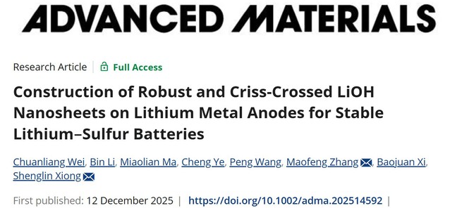 近日,宣城校区化学与化工学院能源化工系新进落地教师魏传亮博士、张茂峰教授等人联合山东大学熊胜林教授(我校兼职教授),在国际顶级期刊《Advanced Materials》上发表了题为“Construction of Robust and Criss-Crossed LiOH Nanosheets on Lithium Metal Anodes for Stable Lithium–Sulfur Batteries”的研究论文。魏传亮博士为论文第一作者,张茂峰教授和熊胜林教授为论文共同通讯作者。合肥工业大学为论文第一通讯单位。