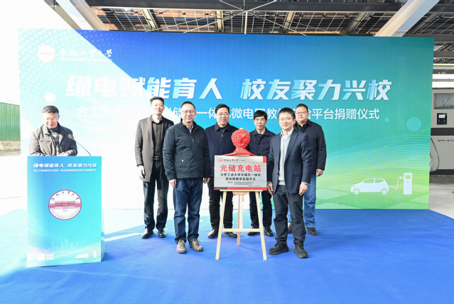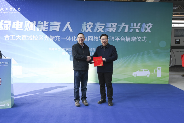 该平台由合工大校友杨钧旗下的南京国网电瑞电力科技有限公司、南京电瑞新能源科技有限公司联合捐赠,此次捐赠的光储充微电网实验平台,配备300KWp光伏、300kWh储能、3套120kW储能式充电桩及先进EMS系统,是集“教学、科研、示范、可持续运行”于一体的真实工程系统。杨钧在发言中表示,母校的“厚德、笃学、崇实、尚新”精神为其创业之路筑牢根基,此次捐赠既是反哺母校的责任之举,也是深化产教融合的初心使然。平台将为电气、能源、自动化等专业学子提供一线工程实践环境,为教师新能源领域科研提供真实场景,助力校区在“双碳”背景下探索绿色校园能源模式。