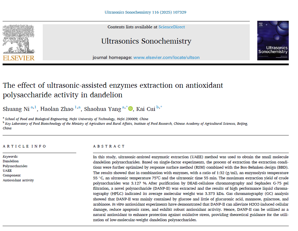 近日,宣城校区食品科学系2021级本科生王亦韬,2020级本科生倪霜,2019级本科生赵皓岚组成的科研团队以第一作者身份在国际知名期刊Ultrasonics Sonochemistry(中科院1区TOP,IF=9.7)和International Journal of Biological Macromolecules(中科院2区TOP,IF=8.5)连续发表了2篇题为“The effect of ultrasonic-assisted enzymes extraction on antioxidant polysaccharide activity in...