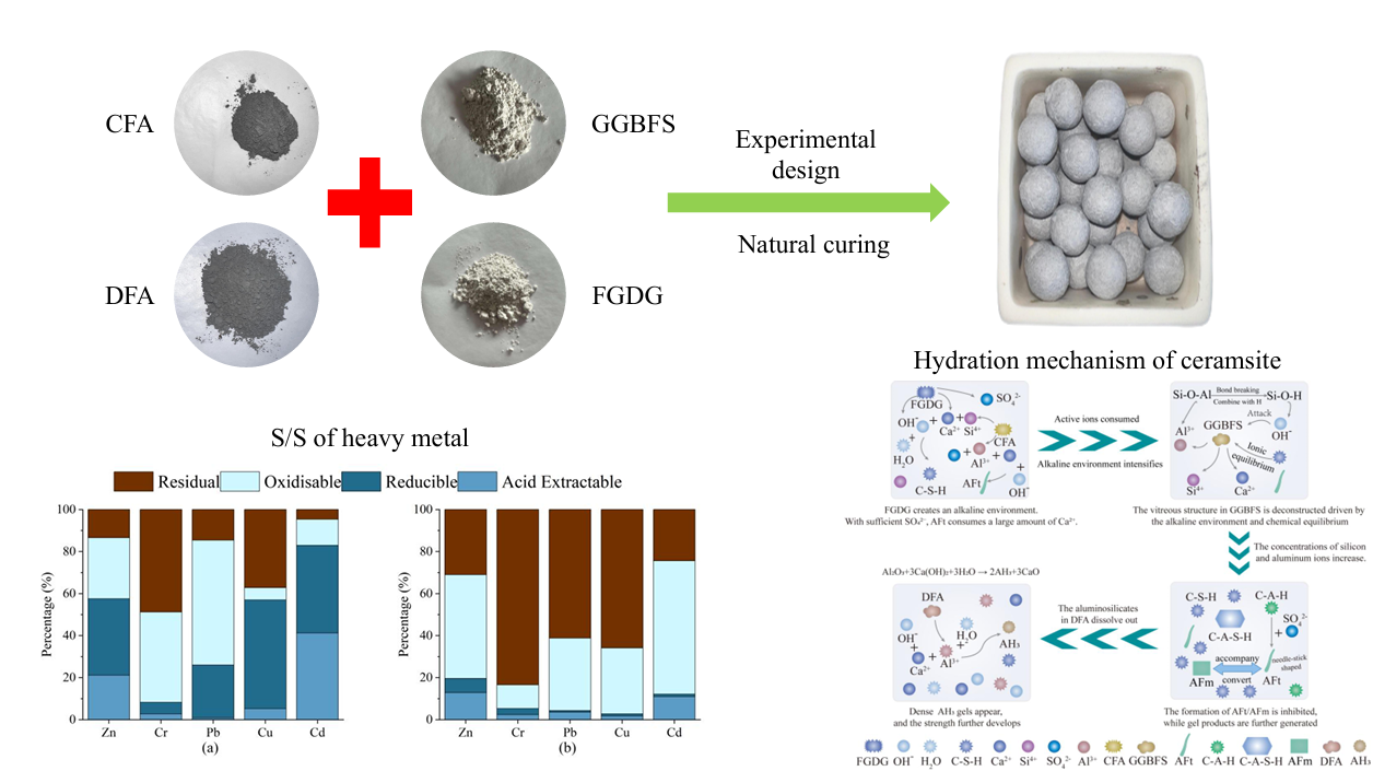 该研究针对传统建材行业高能耗、高碳排和矿产资源消耗以及大宗固废处理处置等难题,对粉煤灰、脱氯生活垃圾焚烧飞灰等固废进行配比设计及优化,获得一种低碳全固废基免烧陶粒。该固废资源化方法能够拓宽陶粒生产的原料来源,并减轻与工业固废处置和传统烧制建筑材料相关的经济和环境负担;通过材料表征技术进一步揭示了全固废基免烧陶粒的水化机理,创新性地提出了全固废基免烧陶粒的矿物相和凝胶相的竞争性生成机制。这项研究成果不仅为双碳目标下建材行业尤其是水泥行业低碳化转型提供了科学依据,也为构建“无废城市”指出了可行道路。