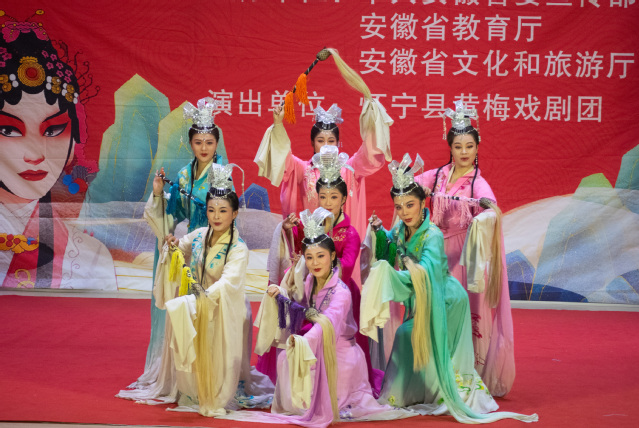 演出现场,怀宁县黄梅戏剧团的艺术家们精心为大家准备了8个经典剧目。演员们身着雅致戏服,以圆润婉转的唱腔、形神兼备的身段与扎实功底,将黄梅戏的清新韵味展现得淋漓尽致。《鹊桥》的浪漫、《状元府》的飒爽让师生领略经典魅力,《闹花灯》的活泼互动引得全场笑声不断,《孔雀东南飞》的唯美演绎更让人沉醉,演出现场掌声与喝彩声此起彼伏,氛围热烈高涨。