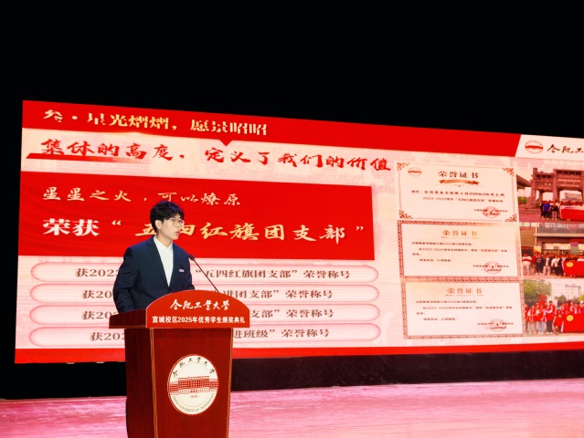 星光闪耀,礼赞青春。12月9日,“青春奋斗·榜样领航”宣城校区2025年优秀学生颁奖典礼在大学生活动中心大礼堂举行。宣城校区党委副书记、管委会主任蒋传东,纪委书记葛万锋,管委会副主任李友良及相关部门负责同志出席典礼。