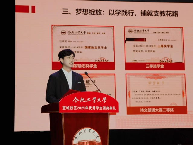 典礼在庄严的国歌声中拉开帷幕,出席典礼的领导分别为国家奖学金、国家励志奖学金、优秀学生先进个人、优秀学生奖学金、先进班级、先进寝室获奖代表颁奖,并寄语获奖同学充分发挥榜样示范引领作用,在推进强国建设、民族复兴伟业中展现青春作为、贡献青春力量。