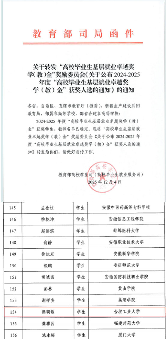 2022年起,中国教育发展基金会设立“高校毕业生基层就业卓越奖学(教)金”项目,奖励在基层就业有突出业绩和显著成效的高校毕业生、服务毕业生赴基层就业有突出贡献的教师,选树优秀典型。2024-2025年度,全国418名高校毕业生获此殊荣,熊朝敏的入选充分彰显了我校毕业生的过硬素质与责任担当。