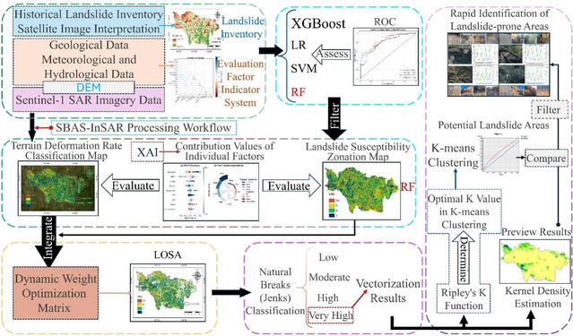 该研究针对传统滑坡易发性评估方法在解释性和动态监测方面的不足,创新性地提出了“滑坡优化易发性评估框架”(Landslide Optimised Susceptibility Assessment, 简称LOSA)。LOSA框架巧妙地融合了小基线集差分干涉合成孔径雷达(SBAS-InSAR)时序形变监测数据与基于随机森林的可解释机器学习模型,并通过SHapley加性解释(SHAP)方法,深入剖析了滑坡发生的主导因素。