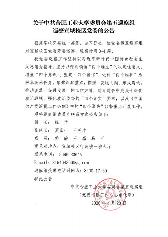 关于中共合肥工业大学委员会第五巡察组巡察宣城校区党委的公告