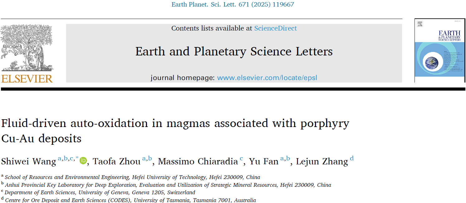 近日,合肥工业大学资源与环境工程学院周涛发教授团队联合瑞士日内瓦大学、澳大利亚塔斯马尼亚大学等单位在国际著名期刊《地球与行星科学快报》(Earth and Planetary Science Letters)上发表了最新研究成果,提出了一种全新的“流体驱动自氧化(fluid-driven auto-oxidation)”机制,为解释斑岩型铜金矿床形成过程中岩浆氧逸度升高提供了新的理论框架。斑岩型铜金矿床是地球上最重要的...